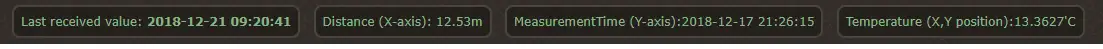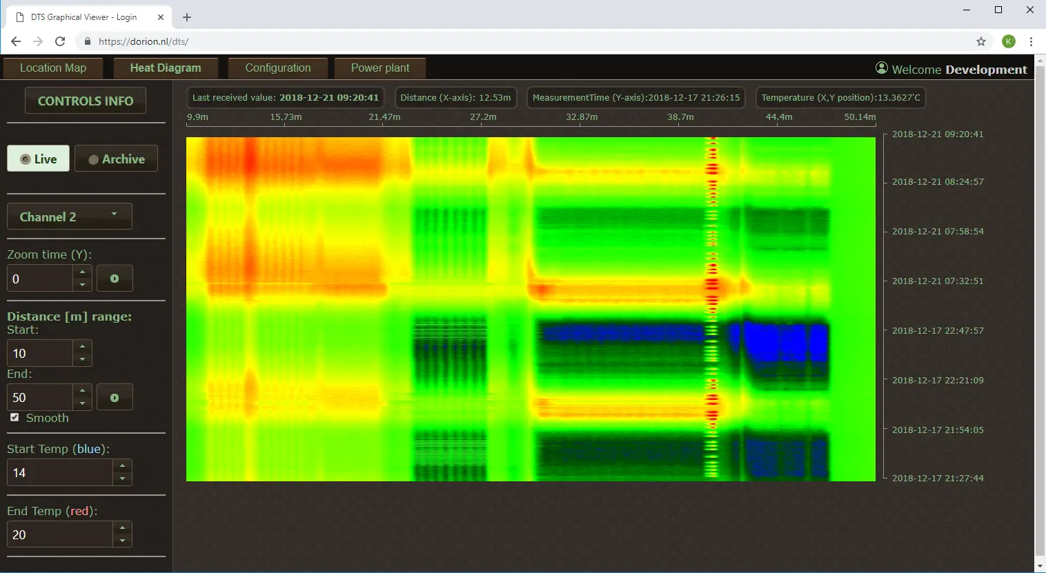De viewer-software wordt bij openen van de webpagina gedownload naar de client, en via een data connectie wordt de meetdata, locatie, etc opgehaald uit de database. De viewer toont de meetdata grafisch in een diagram, waarbij de X-as de afstand en de Y-as de tijd weer geeft: en de kleur de temperatuur. Op die manier is het snel inzichtelijk waar afwijkende temperaturen voorkomen, en op welk moment. dit kan bijv. gebruikt worden om (fabrieks) processen te bewaken, denk aan leiding temperaturen, temperaturen van lagers, etc. etc. Naast het grafisch weergeven van de temperatuur kunnen er ook alarmen ingesteld worden, zodat er (bijv) een mail verzonden wordt als een bepaalt traject onder of boven een ingestelde waarde komt. De “ruwe” meetdata is ook beschikbaar voor verdere analyse. (via API op te vragen). Momenteel verwerken we 1.7 miljard temperatuur metingen per week.