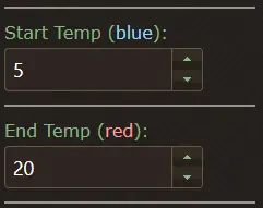 De kleurweergave van de viewer wordt bepaald door de Start en Eind temperatuur instelling. De kleuren worden gelijkmatig verdeeld tussen de onder-temperatuur en boven-temperatuur, van Blauw naar Groen naar Geel naar Orange naar Rood. Door het aanpassen van de start en eindtemperatuur kunnen er meer details zichtbaar gemaakt worden. Bijv. door de Start temperatuur in te stellen net onder de omgevings temperatuur, en de Eindtemperatuur net boven de hoogste temperatuur van de foutaansluiting.