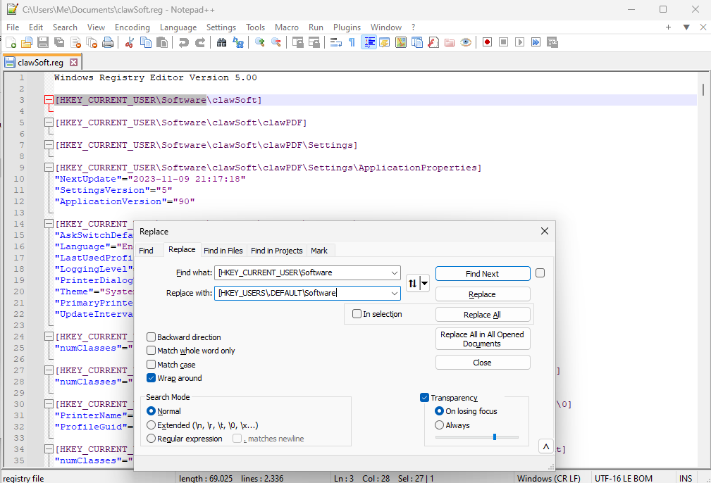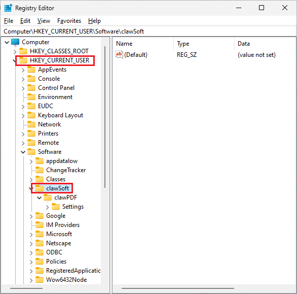 Right click “clawSoft” and export the whole ClawSoft tree to file. Open the file in Notepad and use Find-and-replace to replace the registry path.