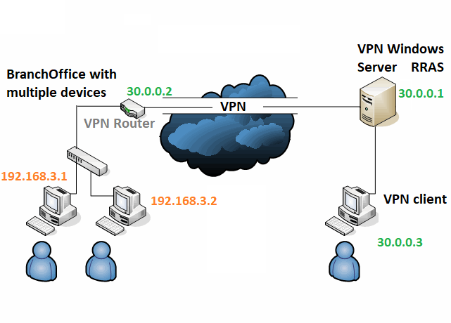 finished. Now configure your SSTP/IPSEC client (on your server or VPN Router) to use this Username and password to connect. Now RRAS will see this connection as a site-to-site VPN, and now you are able to ping from client 30.0.0.3 to client 192.168.3.2 in the BranchOffice.