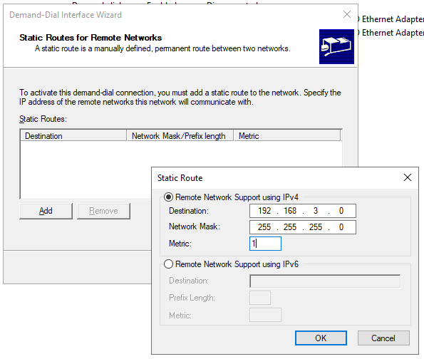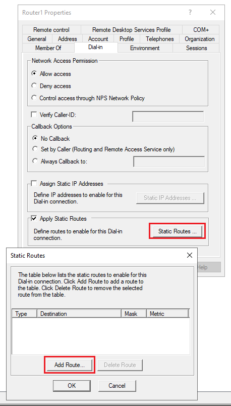 When you create a VPN account and use it for this server or VPN router, you might discover that you are not able to connect back to devices connected to the local LAN of this server or router. if you try to ping, you get a “general failure”. googleing around will learn that you can either add a static route in CMD via add route, or even better, you can specify a static route on the user used for the VPN connection: