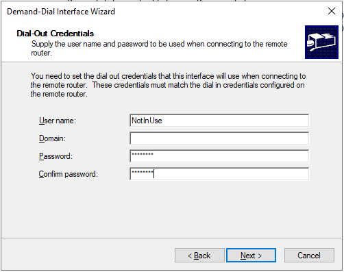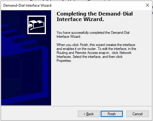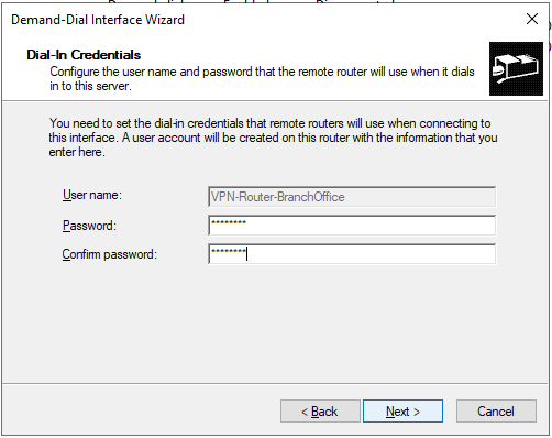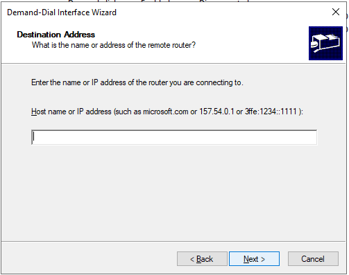 and here comes the solution: a Demand Dial interface is used for a Site-to-Site VPN connection, and you can configure the interface to automatically connect to the BranchOffice. (Then your branch office needs to have a fixed ipaddress, open port, RRAS running, etc.) In our case we don’t have that, and we don’t want to, we want the branchOffice to connect to the VPN server. So leave it empty(!).