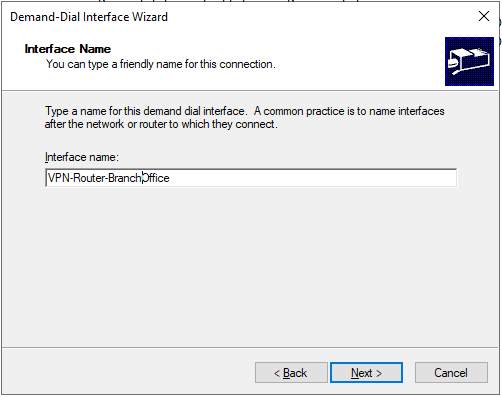 Pick a logical name, this name will be the name of the Demand Dial Interface and also be the name of the VPN user.